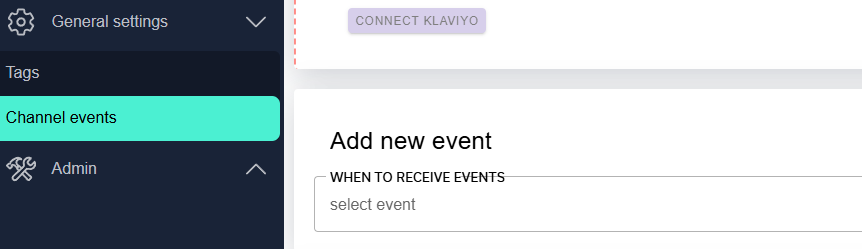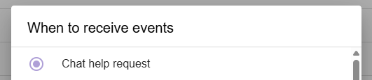 Above: the notification for the merchant of an incoming chat request should be configured from the "General settings" main menu under "Channel events".