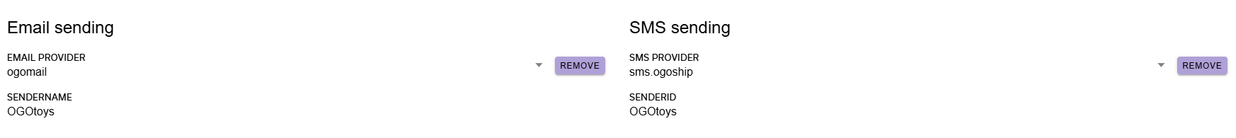 And lastly, please activate the email and SMS sending servers and specify a sender name that will be visible as the sender of the emails and SMS messages. "ogomail" and "sms.ogoship" should be selected.