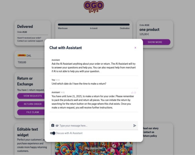 It is a smart customer support tool that provides instant answers directly on tracking and return pages (if enabled). OGOship AI Chat delivers 24/7 automated assistance, reducing support workload while keeping customers satisfied with immediate, intelligent responses.